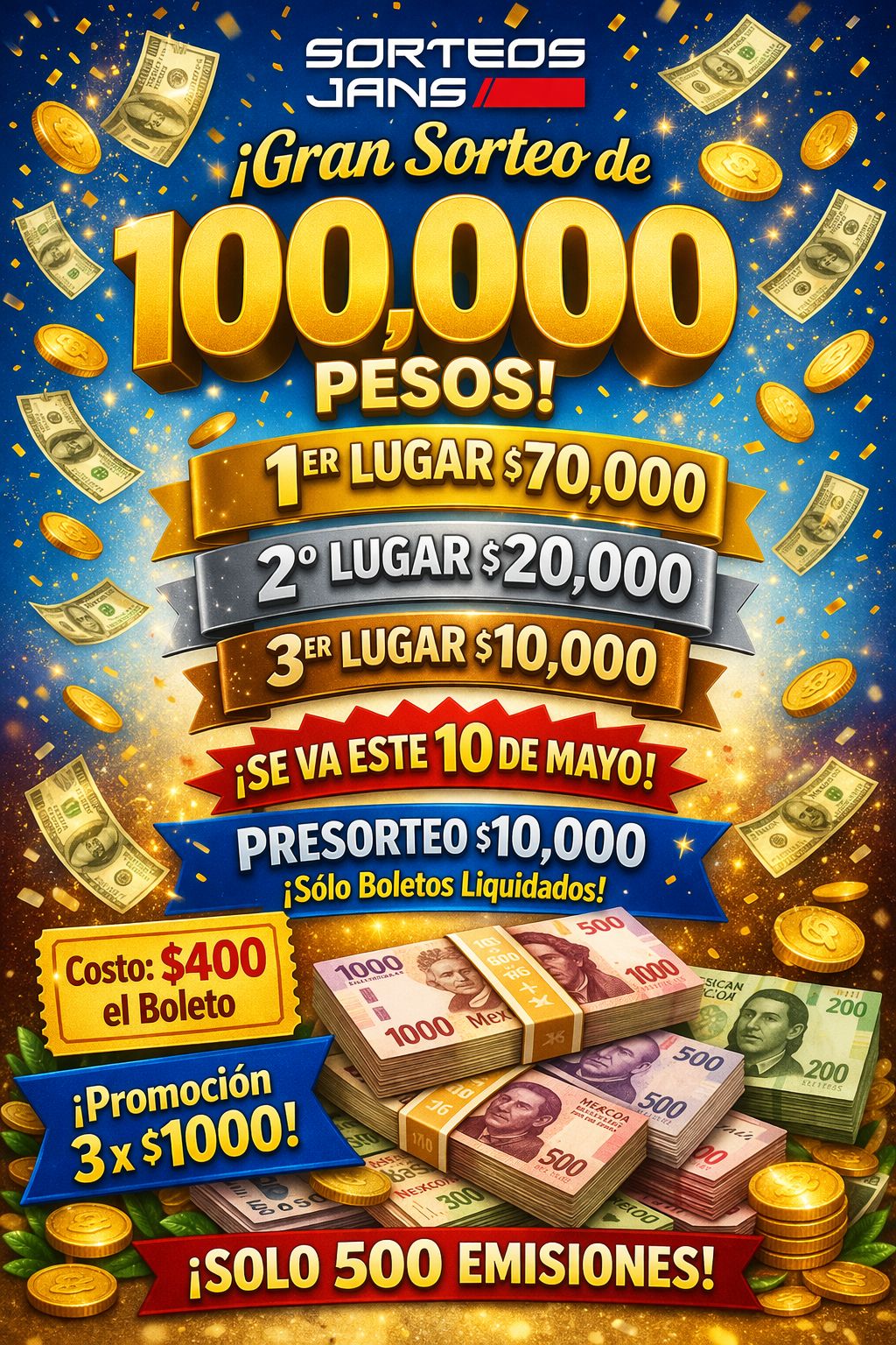 ¡GANA $100,000 EN EFECTIVO!💰 🥇70,000 🥈20,000 🥉10,000 🎉 PRESORTEO: 💵 $10,000 en efectivo 📅 24 de abril (solo con boletos líquidos) 🎁 GRAN SORTEO: 📅 10 de mayo 💥 ¡El día que puedes llevarte TODO! 🎫 COSTO DEL BOLETO: $400 🔥 PROMOCIÓN: 👉 3 boletos por $1,000 ⚠️ ¡Solo 500 emisiones!